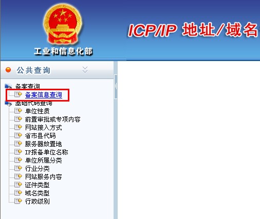 在打開的頁面中,左側有一列導航鏈接,點擊最上面的“備案信息查詢”,如下圖