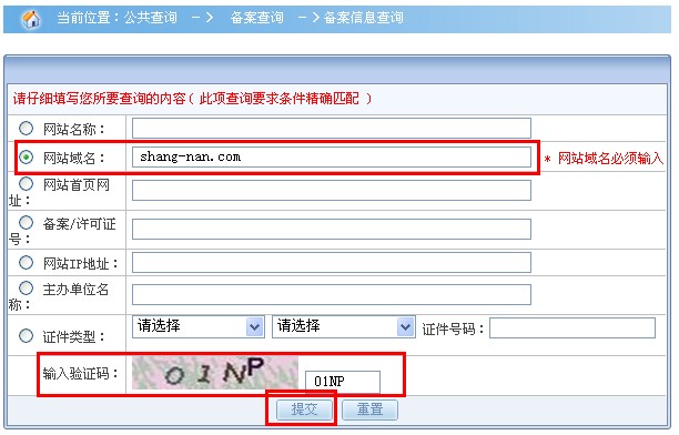 在頁面右邊會出現查詢條件窗口中輸入查詢條件及驗證碼,點擊“提交”即可。以按照“網站域名”查詢為例,如下圖