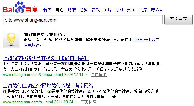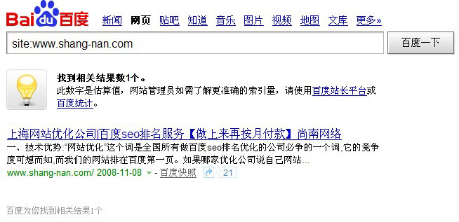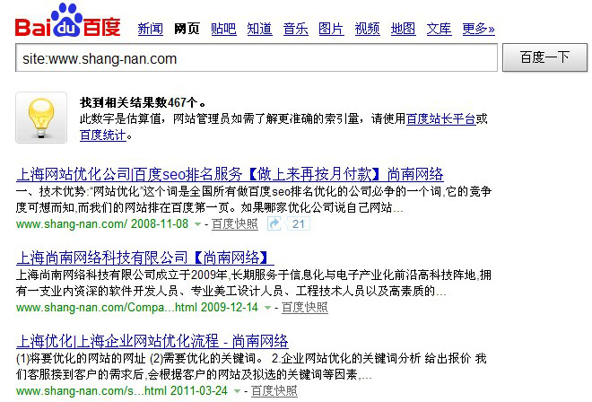 第一、首先通過site:指令來查詢網(wǎng)站收錄變化,比如說你的網(wǎng)址是www.g3929.cn,就在百度里搜索“site:www.g3929.cn”來查詢你的網(wǎng)站收錄情況,site指令查詢結(jié)果主要有以下幾種情況: