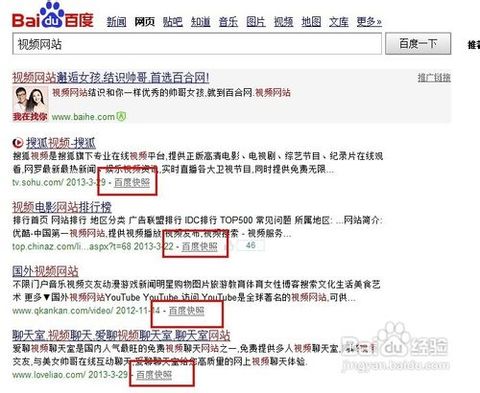2、怎么找到百度快照?打開 www.baidu.com 輸入你要查找的關(guān)鍵詞,比如說視頻網(wǎng)站。可以看到在紅色方框表中的區(qū)域有百度快照的字樣。鼠標(biāo)單擊百度快照就能打開瀏覽網(wǎng)頁了, 百度快照的服務(wù)穩(wěn)定,下載速度極快,您不會再受死鏈接或網(wǎng)絡(luò)堵塞的影響。
