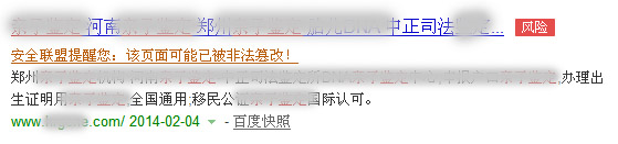 如果我們的網(wǎng)站出現(xiàn)漏洞并且受到了黑客入侵,網(wǎng)頁(yè)上被植入了大量黑鏈或者非法廣告都可能出現(xiàn)這種安全風(fēng)險(xiǎn)提示,如下圖所示: