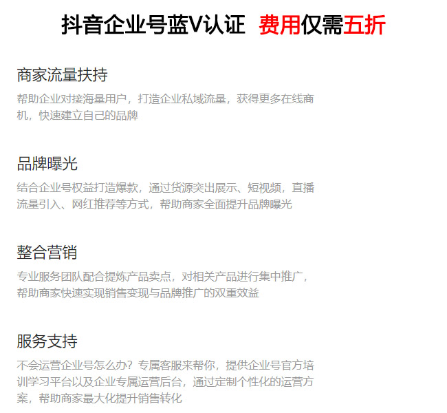 企業(yè)想要運(yùn)營好抖音賬號(hào),首先應(yīng)該開通抖音藍(lán)V認(rèn)證。認(rèn)證通過后將享有十幾項(xiàng)營銷特權(quán):經(jīng)過抖音藍(lán)V認(rèn)證的品牌,可以獲得更多抖音平臺(tái)的推廣服務(wù),比如說: